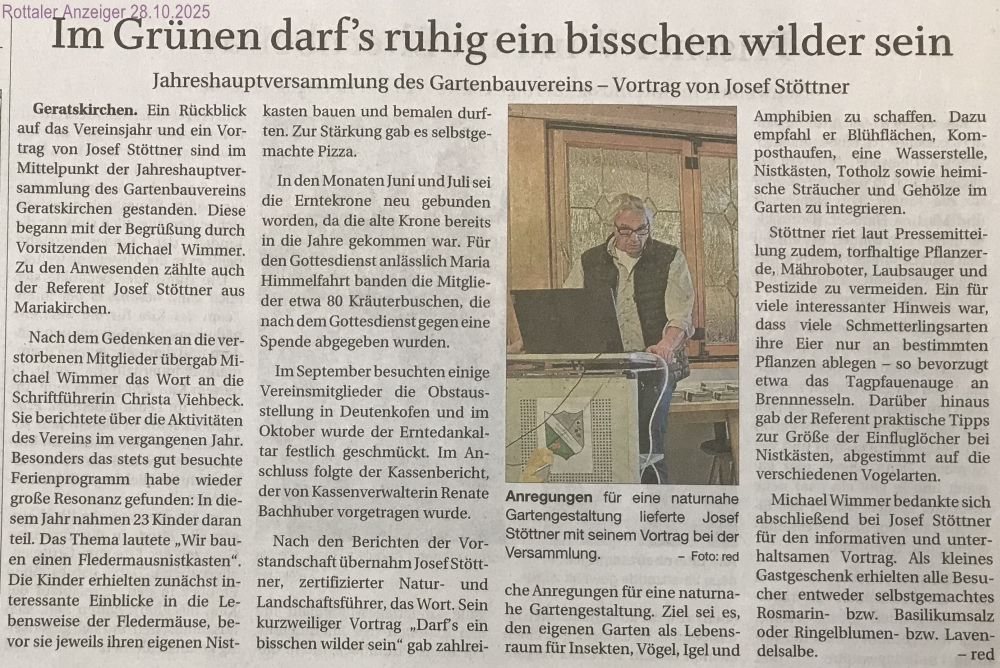 Rottaler Anzeiger 28.10.2025 – Josef Stöttner referiert bei der Jahreshauptversammlung vom Gartenbauverein Geratskirchen über naturnahe Gärten mit dem Thema „Darf’s ein bisschen wilder sein“